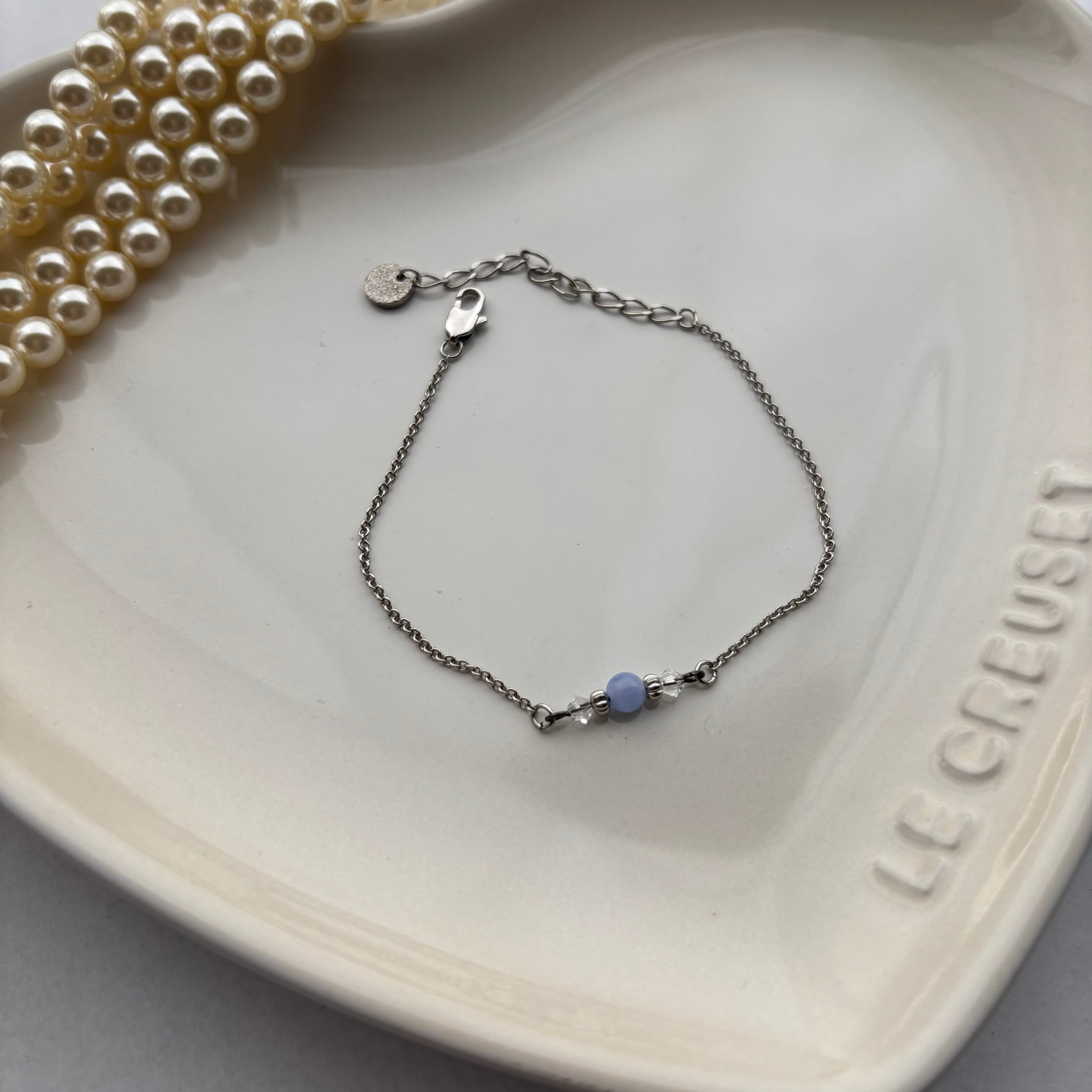 華奢チェーンに、天然石とスワロフスキーのビーズが付いたブレスレットです。