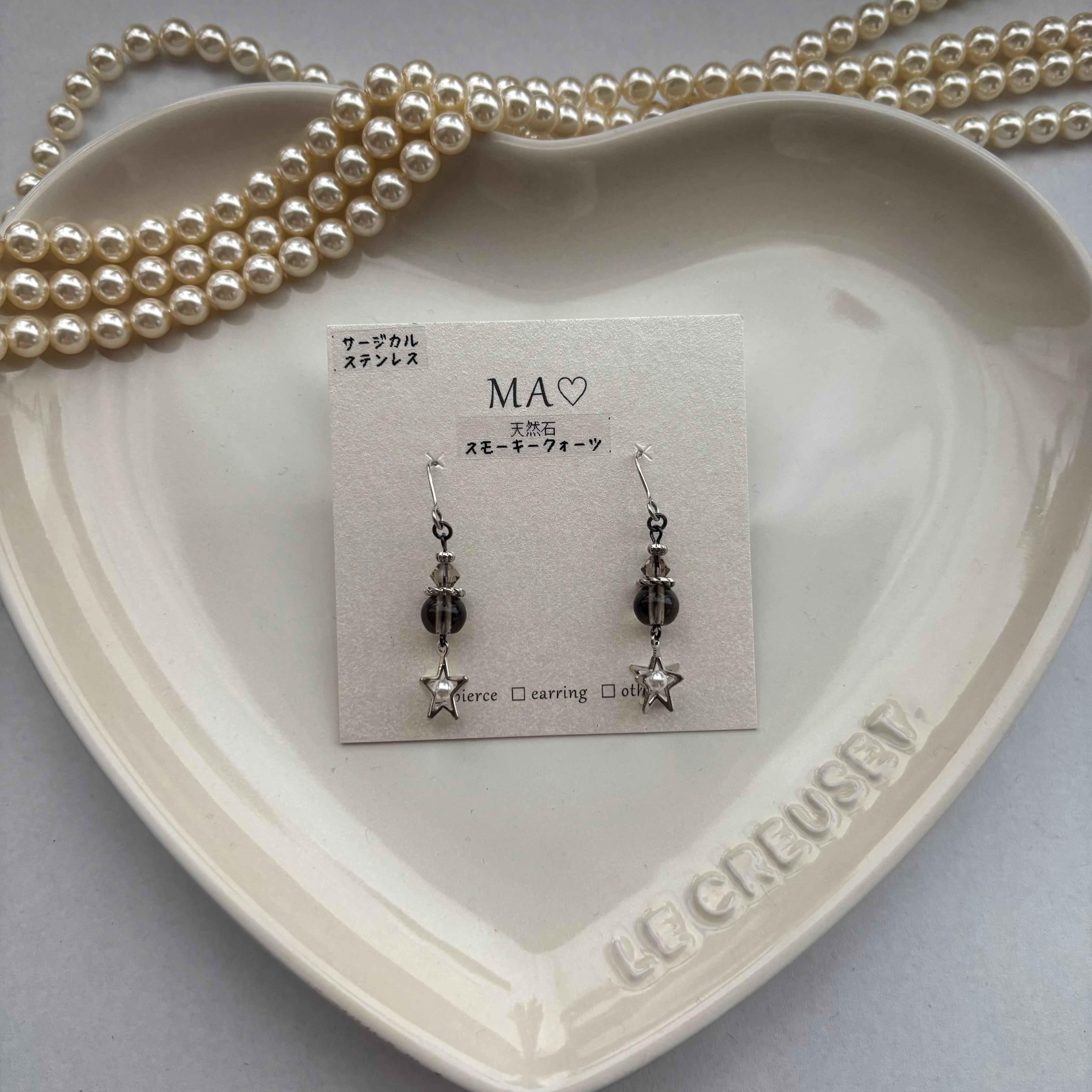 落ち着いた雰囲気のある天然石スモーキークォーツに星のチャームを組み合わせたアクセサリー。