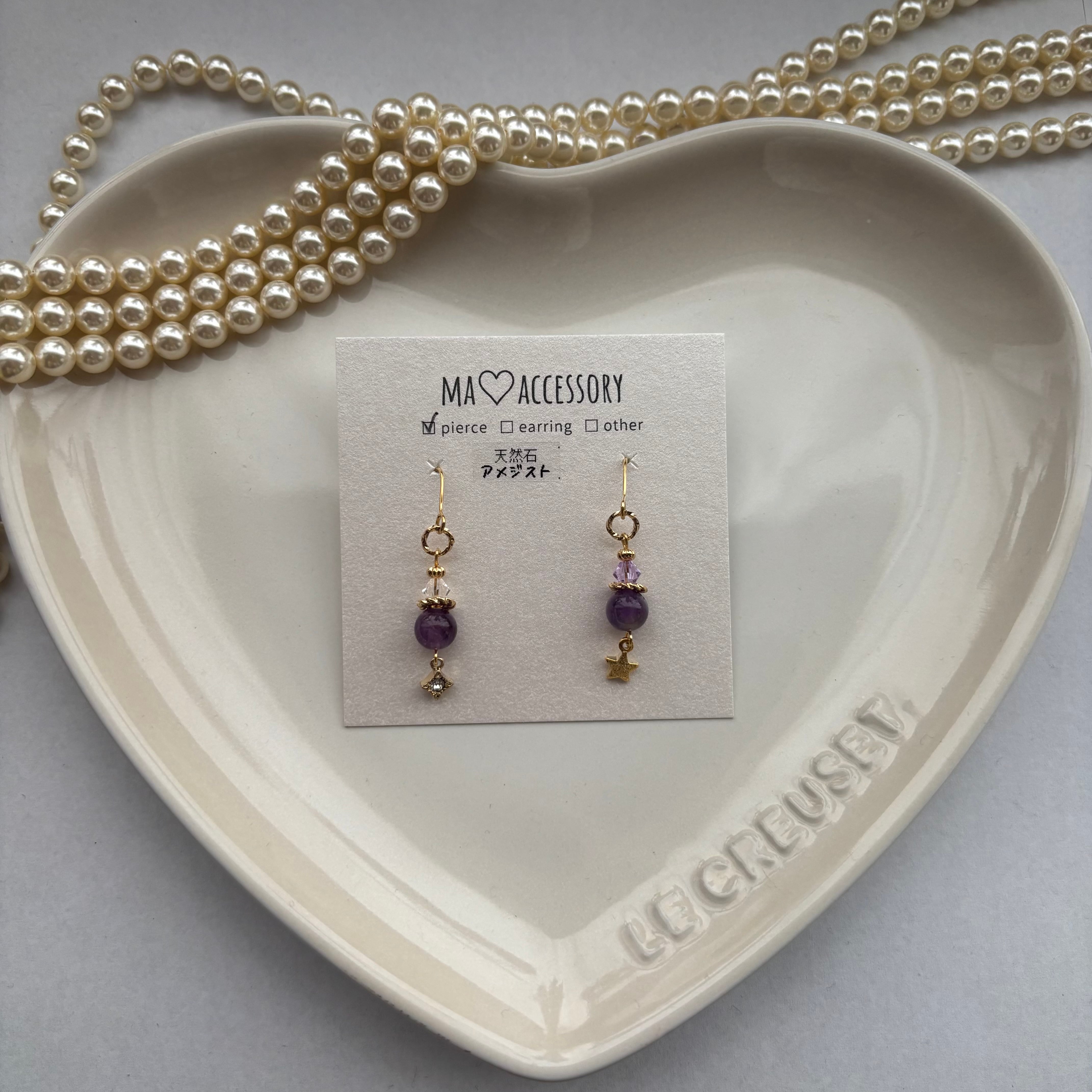 落ち着いた雰囲気のある天然石アメジストにチャームを組み合わせたアクセサリー。
