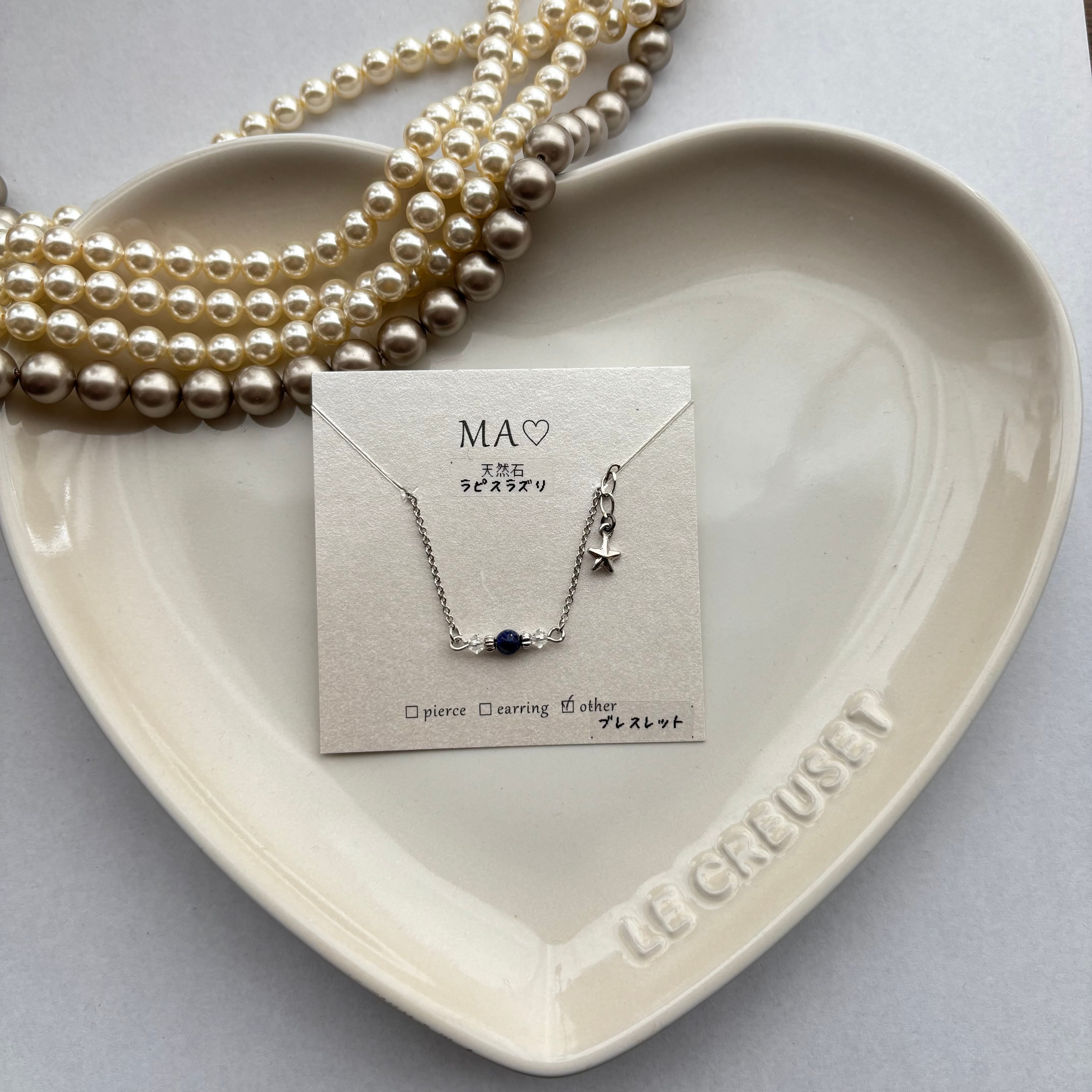 細めのチェーンに、深めのブルーの夜空みたいなラピスラズリの天然石とスワロフスキーのビーズが付いたブレスレットです。