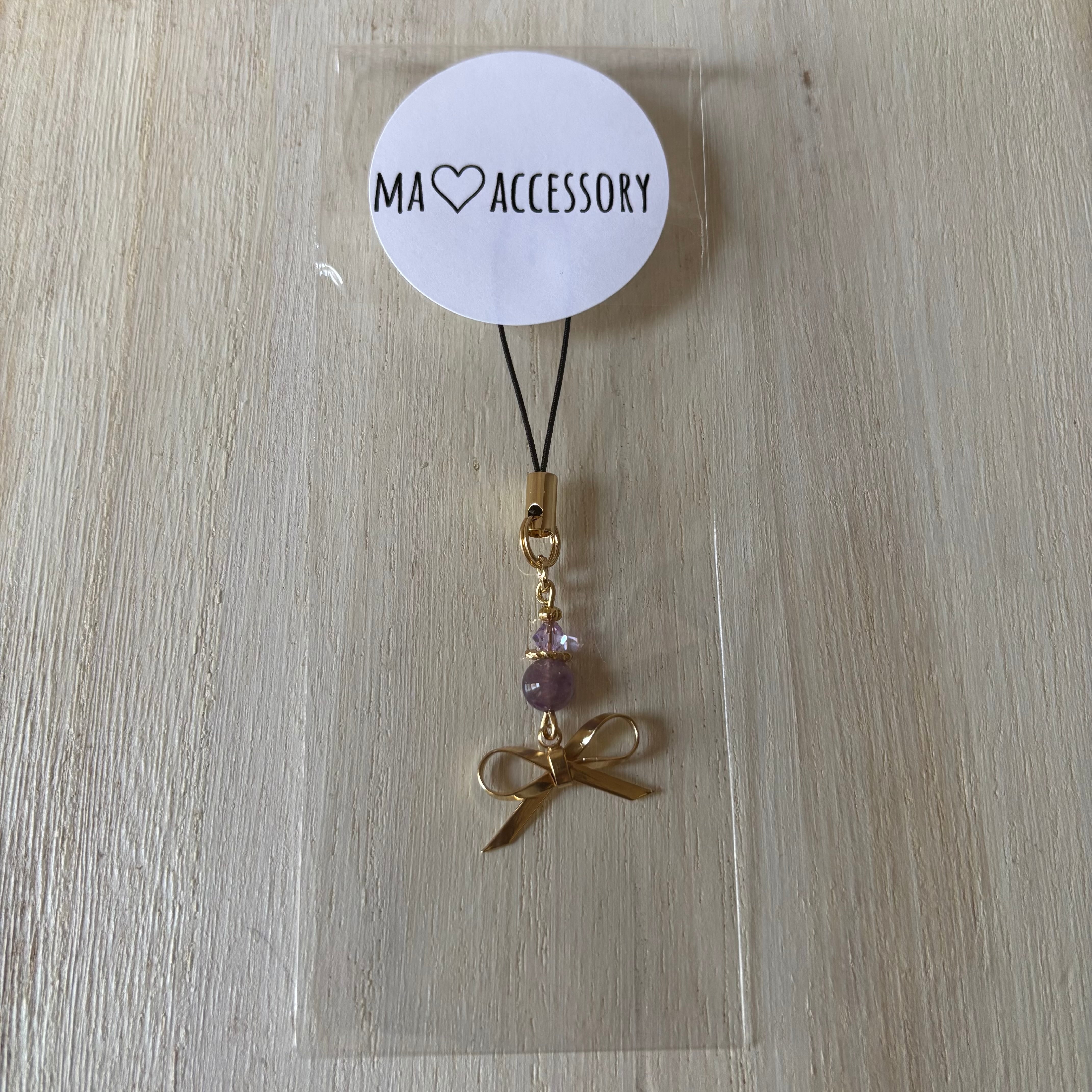 落ち着いた雰囲気で大人かわいいアメジストとリボンのチャームのストラップ。