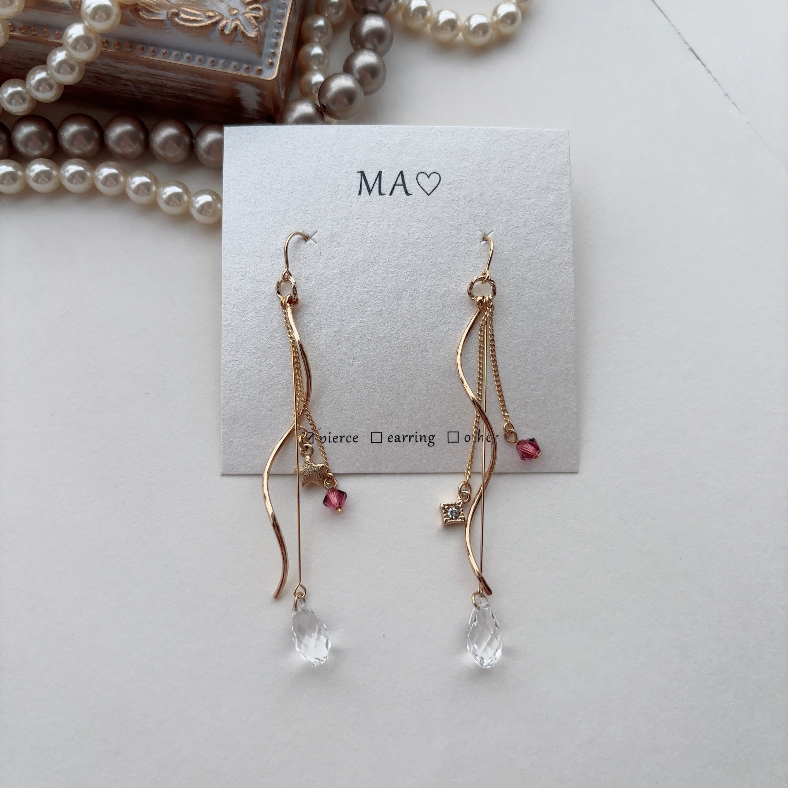 やわらかくカーブしたゴールドラインに、繊細なチェーンとクリアドロップを合わせ、軽やかな動きを演出。
