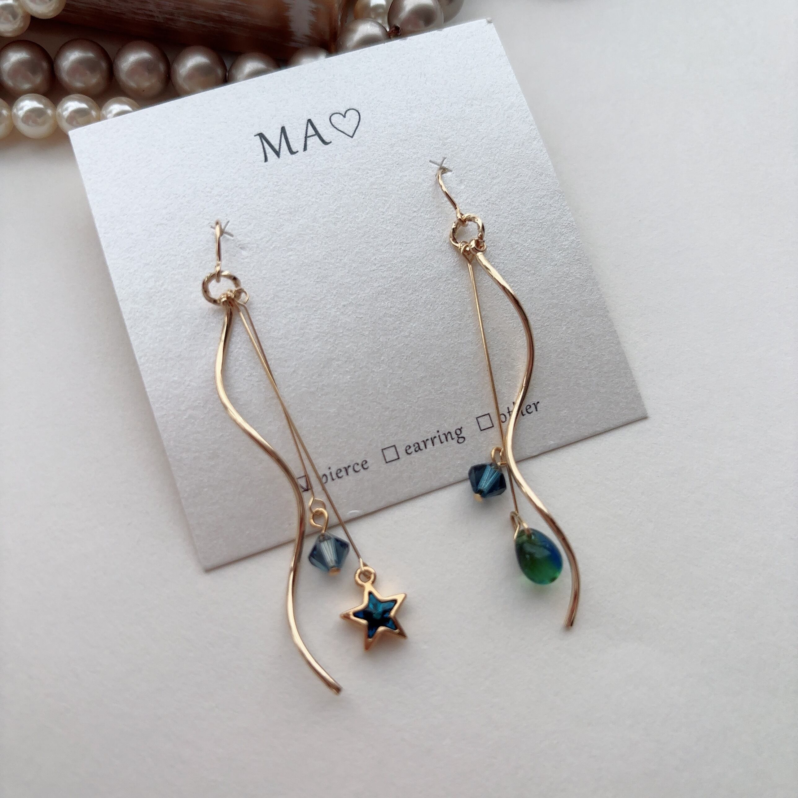 深みのあるブルーとグリーンのパーツをあしらった上品なアシンメトリーデザイン。