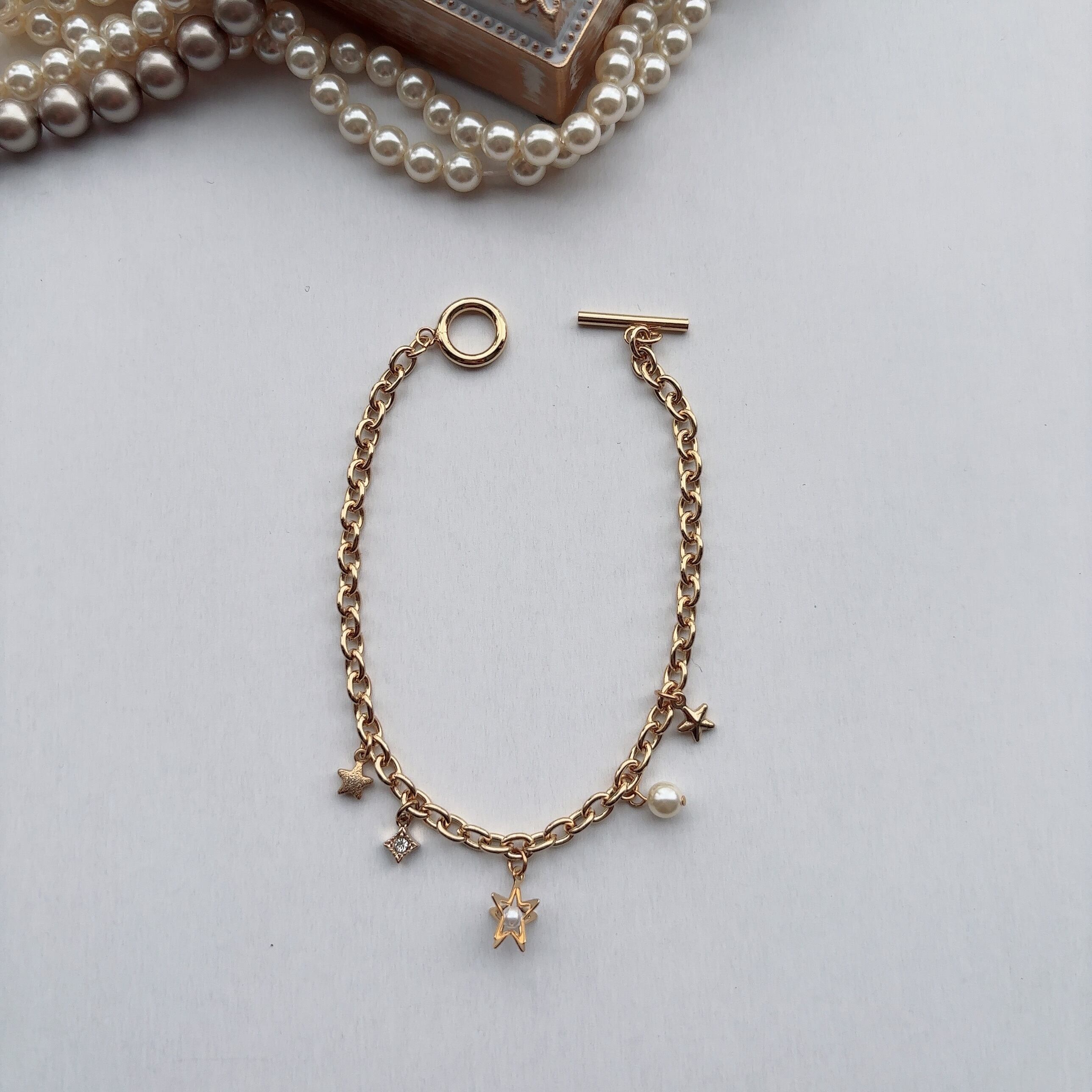 存在感のあるゴールドチェーンに、星やパールをあしらったブレスレット。