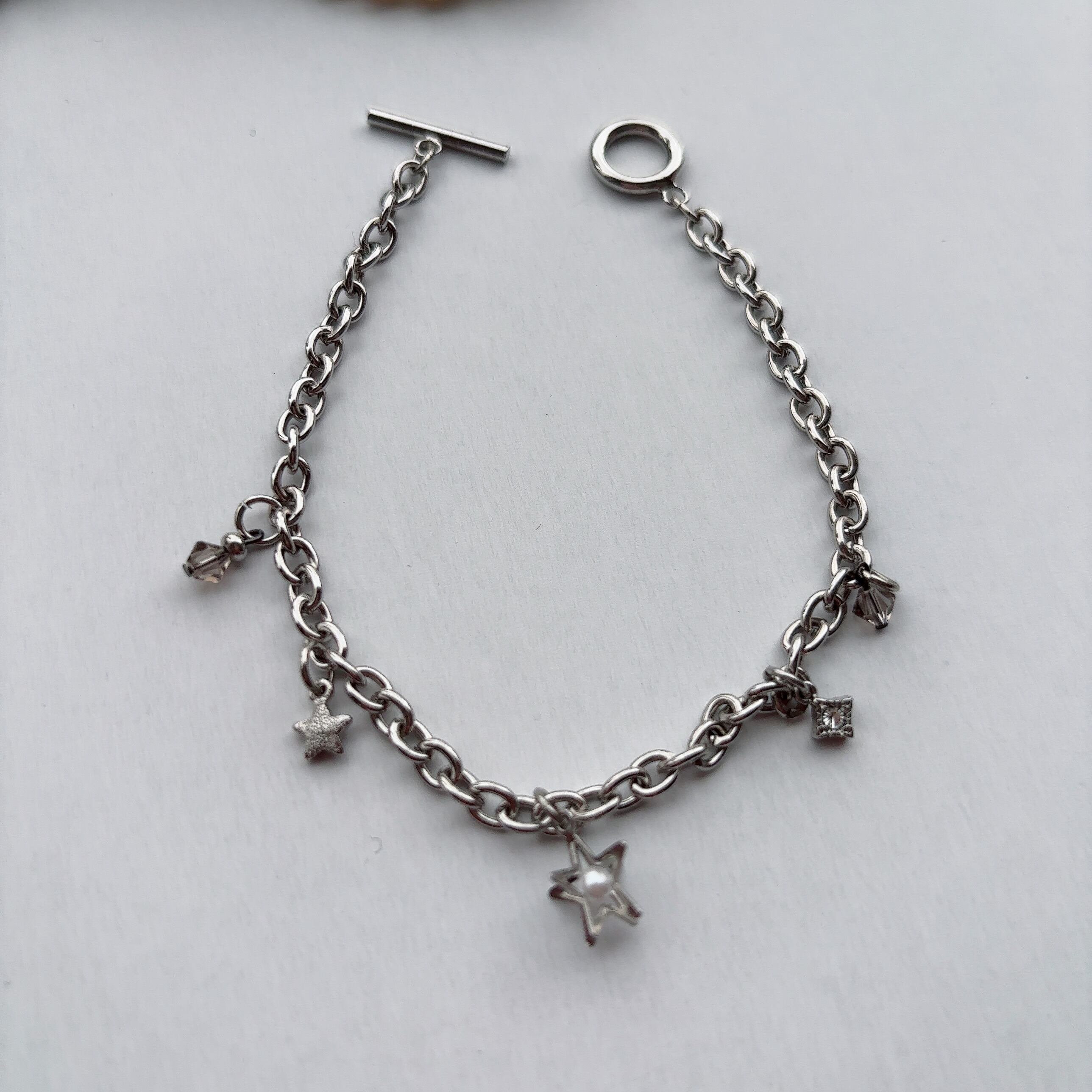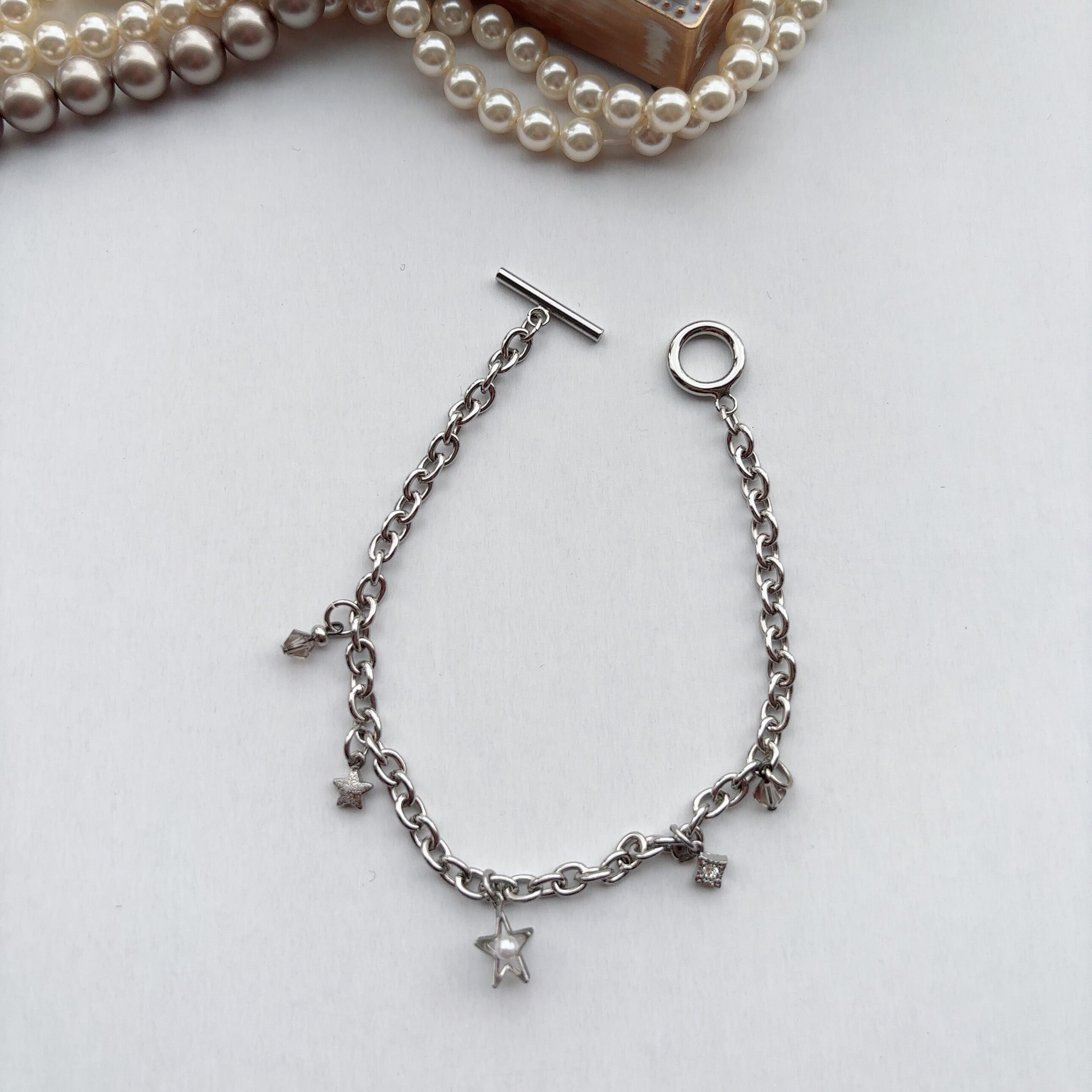 クールなシルバーチェーンに、星や繊細なチャームを散りばめたブレスレット。